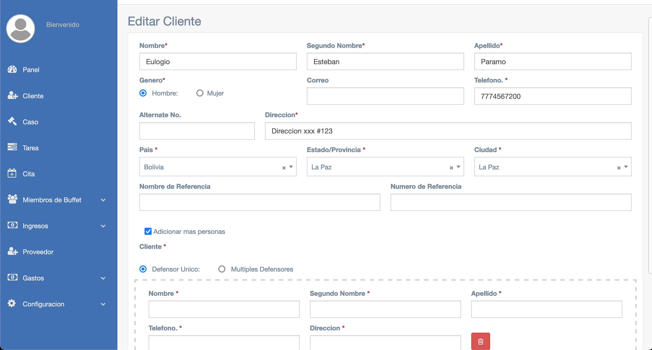 Podras crear y asignar casos a tus clientes, ademas de asignar uno o varios abogados para la defensa de su caso.