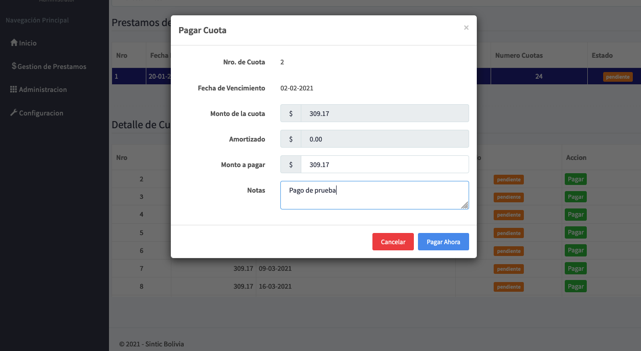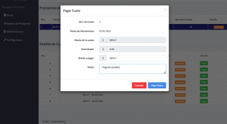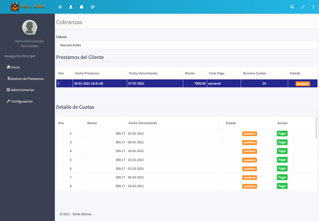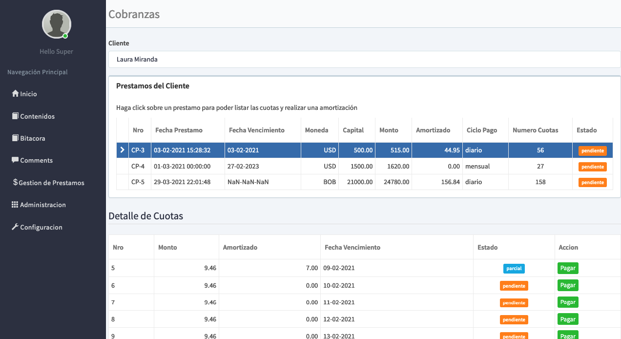 Nuestro sistema le ofrece un software de créditos y cobranzas diseñado especialmente para los prestamistas independientes con Pagos en Cuotas Diarias, Interdiario, Semanales, Quincenales y Mensuales y ademas de poder asignar los intereses por cada prestamo.